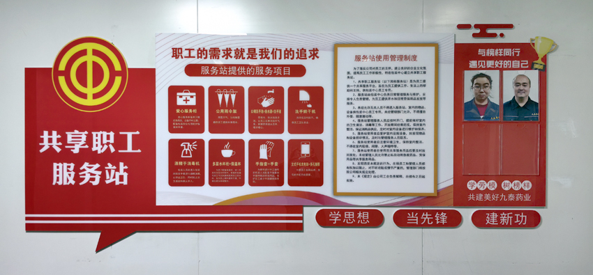 11月25日,公司第一個共享職工服務(wù)站在包裝中心成立并投入使用。共享職工服務(wù)站文化墻上醒目地提示著共享服務(wù)項目、使用管理辦法,為了豐富文化墻內(nèi)容,還增添了“與榜樣同行遇見更好的自己”優(yōu)秀員工光榮榜。共享職工服務(wù)站內(nèi)共享物品齊全,擺放整齊,共享設(shè)施設(shè)備即符合藥企規(guī)范,也充滿溫馨,充滿愛意。服務(wù)站提供的服務(wù)項目包括:1、愛心服務(wù)柜。愛心服務(wù)柜備用日常應(yīng)急藥品,以備不時之需;包裝中心員工每天高效、重復(fù)的包裝動作很容易被包材劃傷手部,愛心服務(wù)柜為包裝崗位員工配備了處理傷口的藥品和防護用品。2、公用雨傘。雨雪天氣,為特殊需要的員工提供共享雨傘。3、白鋼洗手池+熱水器+洗手液。洗手池帶有冷、熱水調(diào)節(jié)開關(guān),讓員工在寒冷的天氣里,能夠使用溫水洗手,暖手暖心。4、洗手烘干機。員工進入操作間洗手后及時烘干,確保員工衛(wèi)生安全。5、酒精手消毒機。包裝人員在進入包裝間前雙手要進行酒精消毒,以保證衛(wèi)生,同時防止交叉感染和病從手入。6、多層水杯柜+保溫杯。為每一名員工配備了大容量保溫杯,統(tǒng)一存放在多層水杯柜中,根據(jù)姓名、編號,員工可以快捷地找到自己的水杯,為員工喝熱水提供方便,環(huán)境也更加美觀整潔。7、手指套+手套。服務(wù)站為常年進行手工操作的包裝人員配備了手指套和手套特殊的勞保用品,保護員工減少手部磨損和受傷。8、立式手機充電站+多孔插排。方便員工各種品牌、型號的手機充電需要。